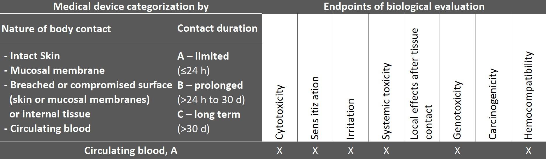 The following excerpt from the table shows the endpoints for a medical device that comes into contact with circulating blood.